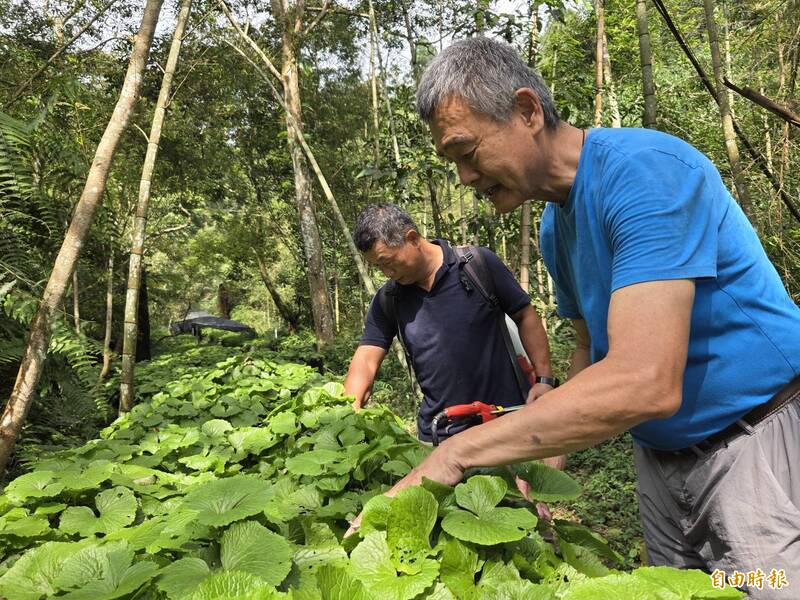 嘉義大學生化科技學系退休教授蔡巨才(右)率領學生組成研究團隊,成功在海拔近900公尺高山區復育山葵。(記者王善嬿攝)